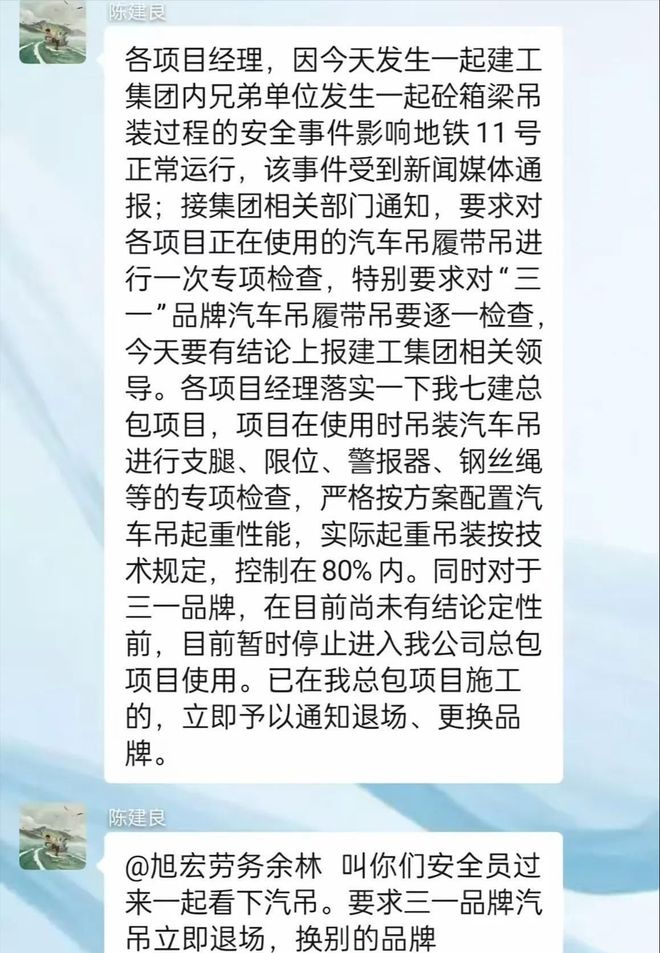 无论是什么原因,施工单位的责任是逃不掉的,而现场作业的三一重工履带吊车,无疑是被推上了风口浪尖,有网友爆出施工群内容,要求全部更换三一重工所有的设备。